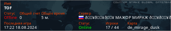 Играет на Counter Strike Global Offensive сервере. Страна: РоссияПервый раз замечен 17:20 18.08.2024