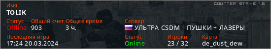 Играет на Counter Strike 1.6 сервере. Страна: РоссияПервый раз замечен 20:34 02.03.2024