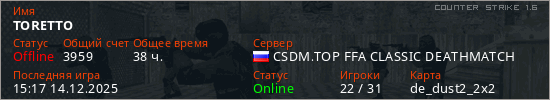 Последний раз был в сети 15:17 14.12.2025 Игрок с таким ником замечен на 17 серверах