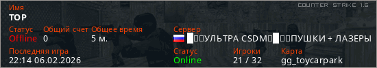 Играет на Counter Strike 1.6 сервере. Страна: РоссияПервый раз замечен 22:12 06.02.2026