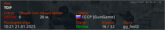 Играет на Counter Strike 1.6 сервере. Страна: РоссияПервый раз замечен 17:56 15.07.2023