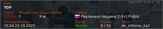 Последний раз был в сети 15:34 25.10.2025 Игрок с таким ником замечен на 30 серверах