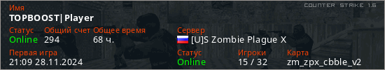Играет на Counter Strike 1.6 сервере. Страна: РоссияПервый раз замечен 21:09 28.11.2024