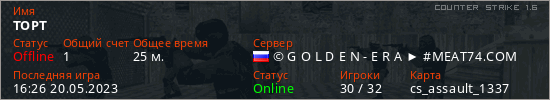 Играет на Counter Strike 1.6 сервере. Страна: РоссияПервый раз замечен 13:46 24.03.2023