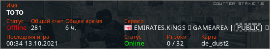 Последний раз был в сети 00:34 13.10.2021 Игрок с таким ником замечен на 21 сервере