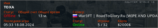 Последний раз был в сети 05:33 18.08.2024 Игрок с таким ником замечен на 24 серверах