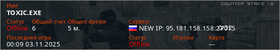 Играет на Counter Strike 1.6 сервере. Страна: РоссияПервый раз замечен 00:07 03.11.2025