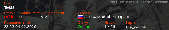 Играет на Call of Duty 4: Modern Warfare сервере. Страна: РоссияПервый раз замечен 22:22 04.02.2026
