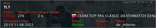 Играет на Counter Strike 1.6 сервере. Страна: РоссияПервый раз замечен 14:28 21.01.2020