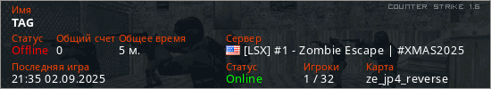 Играет на Counter Strike 1.6 сервере. Страна: СШАПервый раз замечен 21:32 02.09.2025