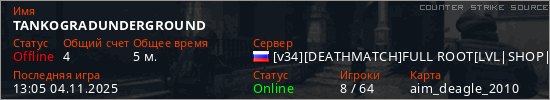 Играет на Counter Strike Source сервере. Страна: РоссияПервый раз замечен 12:53 04.11.2025