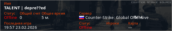 Играет на Counter Strike Source сервере. Страна: РоссияПервый раз замечен 19:46 23.02.2026