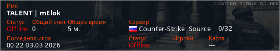 Играет на Counter Strike Source сервере. Страна: РоссияПервый раз замечен 23:44 02.03.2026