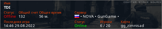 Играет на Counter Strike Source сервере. Страна: РоссияПервый раз замечен 13:52 29.08.2022