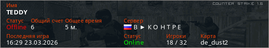 Играет на Counter Strike 1.6 сервере. Страна: РоссияПервый раз замечен 16:27 23.03.2026