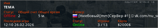 Играет на Counter Strike 1.6 сервере. Страна: РоссияПервый раз замечен 11:58 26.02.2026