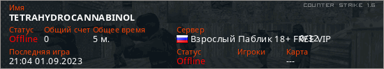 Играет на Counter Strike 1.6 сервере. Страна: РоссияПервый раз замечен 21:02 01.09.2023