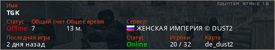 Играет на Counter Strike 1.6 сервере. Страна: РоссияПервый раз замечен 19:51 05.02.2026