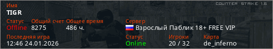Играет на Counter Strike 1.6 сервере. Страна: РоссияПервый раз замечен 18:50 21.10.2019