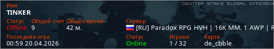 Играет на Counter Strike Global Offensive сервере. Страна: РоссияПервый раз замечен 23:17 15.04.2026