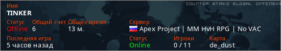 Играет на Counter Strike Global Offensive сервере. Страна: РоссияПервый раз замечен 22:14 16.04.2026