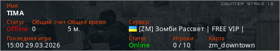 Играет на Counter Strike 1.6 сервере. Страна: УкраинаПервый раз замечен 14:58 29.03.2026