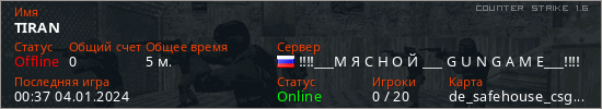Играет на Counter Strike 1.6 сервере. Страна: РоссияПервый раз замечен 00:06 04.01.2024