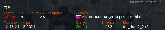 Играет на Counter Strike 1.6 сервере. Страна: РоссияПервый раз замечен 08:41 24.04.2023