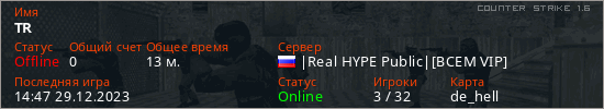 Играет на Counter Strike 1.6 сервере. Страна: РоссияПервый раз замечен 13:53 29.12.2023