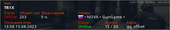 Играет на Counter Strike Source сервере. Страна: РоссияПервый раз замечен 09:27 27.06.2023