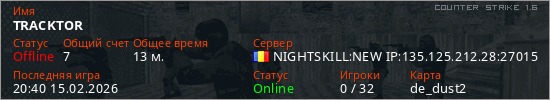 Последний раз был в сети 20:40 15.02.2026 Игрок с таким ником замечен на 2 серверах