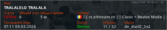 Играет на Counter Strike 1.6 сервере. Страна: РумынияПервый раз замечен 07:03 09.03.2026