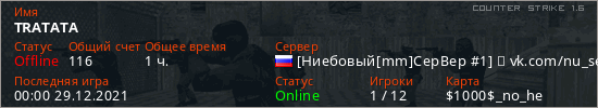 Играет на Counter Strike 1.6 сервере. Страна: РоссияПервый раз замечен 22:13 28.12.2021