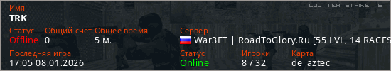 Играет на Counter Strike 1.6 сервере. Страна: РоссияПервый раз замечен 17:01 08.01.2026