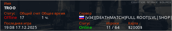 Играет на Counter Strike Source сервере. Страна: РоссияПервый раз замечен 15:11 23.07.2025
