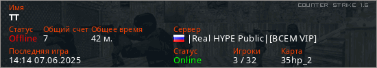 Играет на Counter Strike 1.6 сервере. Страна: РоссияПервый раз замечен 17:58 15.01.2024