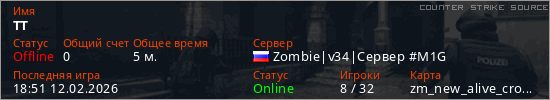 Играет на Counter Strike Source сервере. Страна: РоссияПервый раз замечен 18:49 12.02.2026