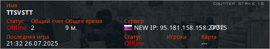 Играет на Counter Strike 1.6 сервере. Страна: РоссияПервый раз замечен 16:29 21.07.2025