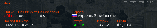 Последний раз был в сети 16:22 13.10.2025 Игрок с таким ником замечен на 34 серверах