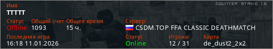 Играет на Counter Strike 1.6 сервере. Страна: РоссияПервый раз замечен 15:08 08.09.2021