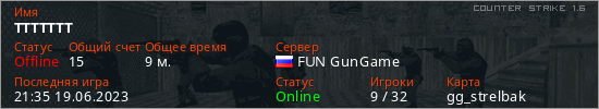 Играет на Counter Strike 1.6 сервере. Страна: РоссияПервый раз замечен 15:42 19.06.2023