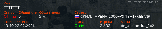 Играет на Counter Strike 1.6 сервере. Страна: РоссияПервый раз замечен 13:47 02.02.2026