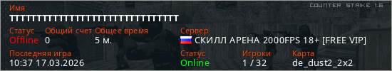 Играет на Counter Strike 1.6 сервере. Страна: РоссияПервый раз замечен 10:14 17.03.2026
