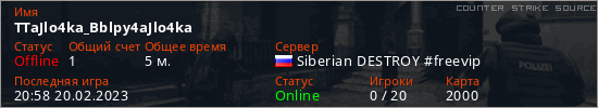 Играет на Counter Strike Source сервере. Страна: РоссияПервый раз замечен 20:56 20.02.2023