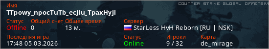 Играет на Counter Strike Global Offensive сервере. Страна: РоссияПервый раз замечен 12:01 05.03.2026