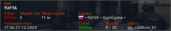 Играет на Counter Strike Source сервере. Страна: РоссияПервый раз замечен 17:26 27.12.2024