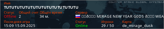 Последний раз был в сети 15:09 15.09.2025 Игрок с таким ником замечен на 5 серверах