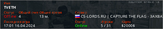 Играет на Counter Strike 1.6 сервере. Страна: РоссияПервый раз замечен 22:15 14.04.2024