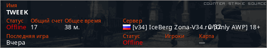 Играет на Counter Strike Source сервере. Страна: РоссияПервый раз замечен 11:32 18.04.2026