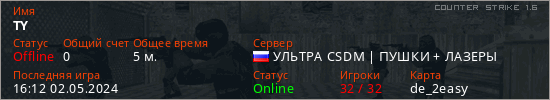 Играет на Counter Strike 1.6 сервере. Страна: РоссияПервый раз замечен 15:55 02.05.2024